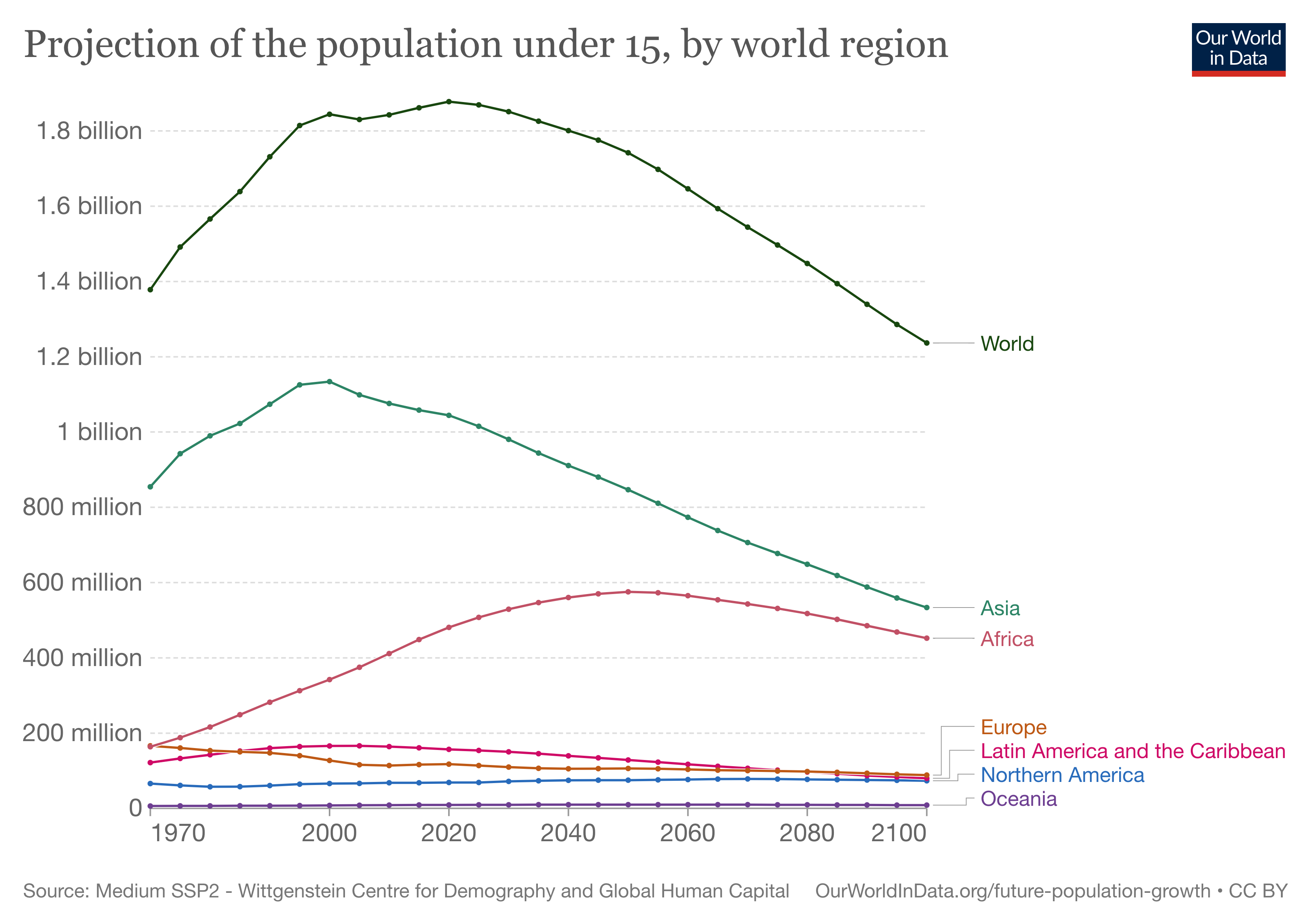 Shown below are the UN projections until the year 2100. Again, note the familiar picture of stagnating population sizes in Oceania, the Americas, and Europe. Due to the low fertility rates in Asia the UN projects a substantial decrease in the number of under-15-year-olds over the coming decades, falling from 1.1 billion today to 0.7 billion by 2100.