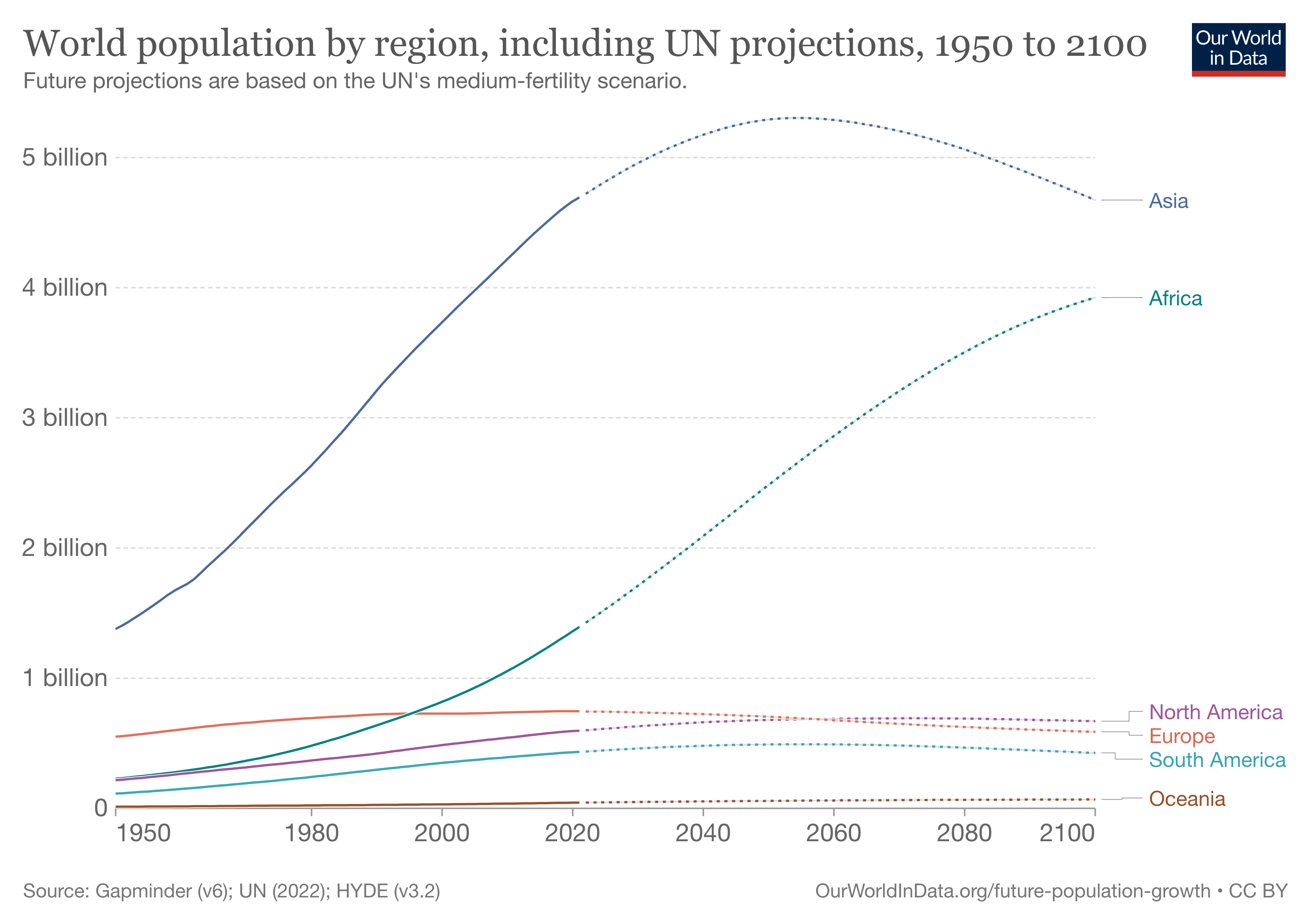 The Medium Variant of the UN projections for all world regions until the end of this century is shown in this chart. Changes to the population size of the Americas, Oceania, and Europe are very small compared to the large expected changes in Asia and Africa. The UN expects the population of Africa to increase 3.5-fold – from 1.3 billion in 2019 to 4.5 billion by the end of the century. The population of Africa then will be as large as the population of Asia today, and the rate of this increase in the coming decades will also be very similar to the rate of population growth in Asia over the last few decades (Asia’s population increased from 1.4 billion in 1950 to 4.5 billion today).