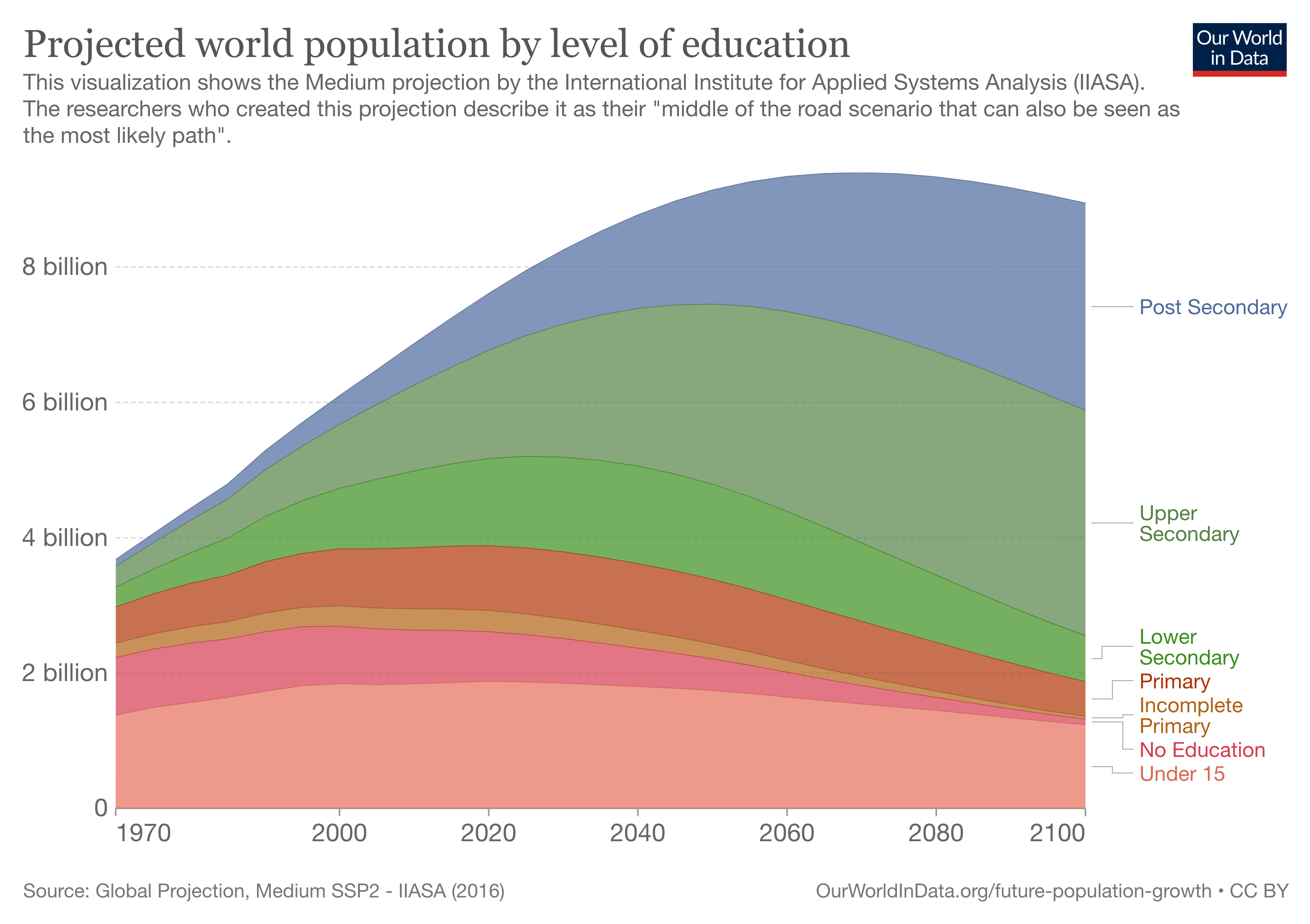 What will be the result of these global demographic changes according to the WC-IIASA demographers? The middle scenario by WC-IIASA for the educational structure of the world population is shown in this chart here.