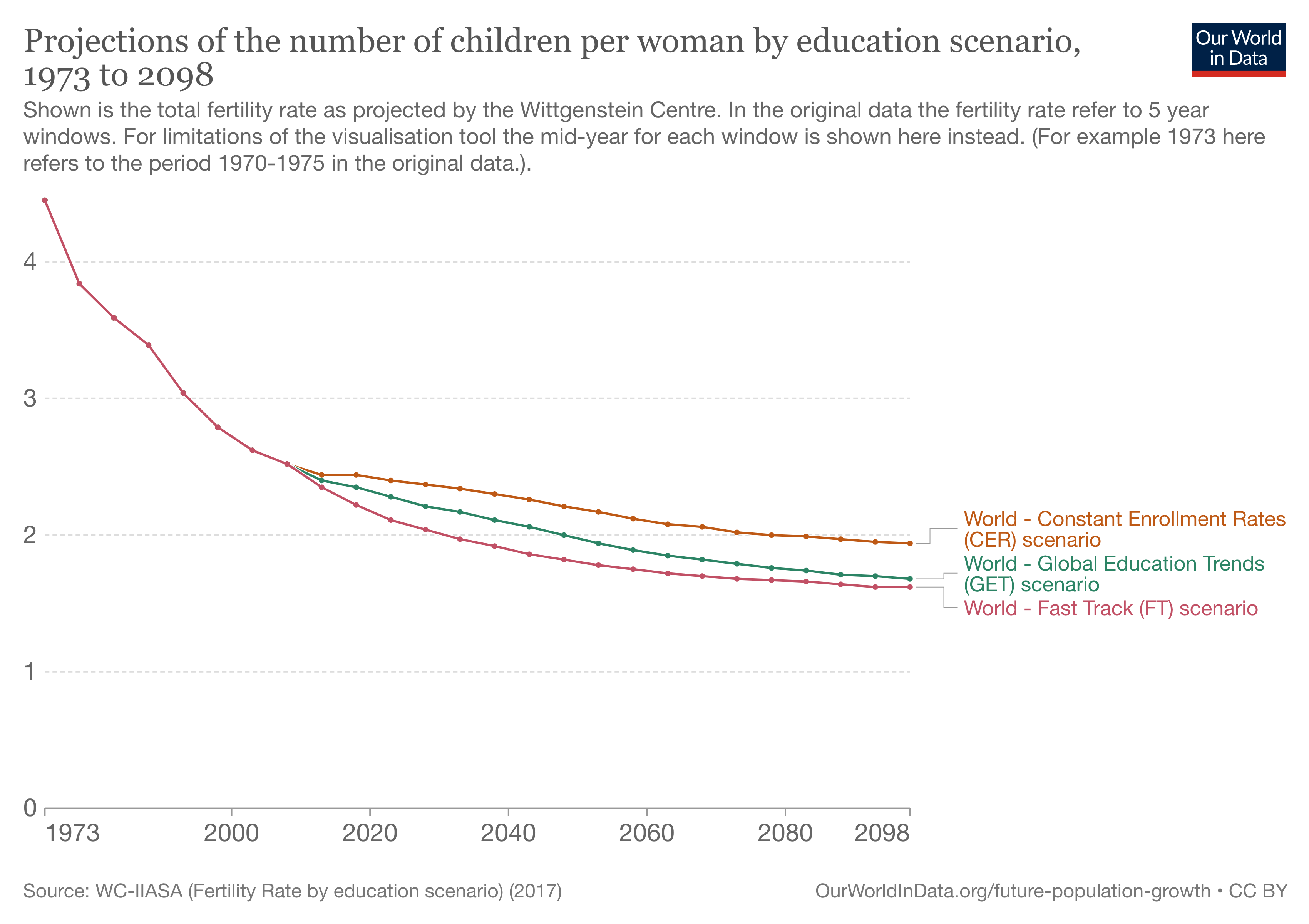 Interestingly the projections for the total fertility rate under the pessimistic Constant Enrollment Rates (CER) scenario are again very similar to the UN Medium projection. Under this scenario the WC-IIASA researchers project a global fertility rate just below 2 and a fertility rate for Africa just above 2. The pessimistic scenario of WC-IIASA is similar to the UN Medium projection, and all of the more optimistic WC-IIASA scenarios imply lower fertility rates. In these optimistic scenarios, the global population is therefore significantly smaller at the end of the century, with smaller cohorts of school-age children throughout this period.