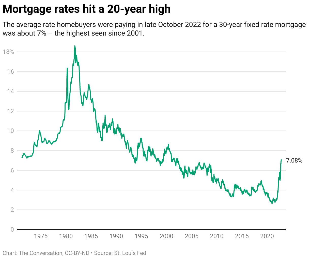 The average interest rate for a new U.S. 30-year fixed-rate mortgage topped 7% in late October 2022 for the first time in more than two decades. It’s a sharp increase from one year earlier, when lenders were charging homebuyers only 3.09% for the same kind of loan.