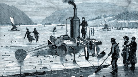 Indeed the ice industry radically changed dietary habits, writes Stott. Thanks to it, salmon and lobster from Boston made its way to Calcutta–where, by 1833, “the first ice cream ever eaten in India was made using Massachusetts ice,” note Kistler, Carter, and Hinchey. Eventually, writes Stott, this is what would lead to the downfall of the ice harvesting industry, taking with it the need for ice harvesters: “[The] demand for ice stimulated the development of reliable means of artificial refrigeration. At the same time, the immediate success of an ice trade based on abundant ice ponds and efficient transportation, postponed the rapid development of artificial ice-making.”