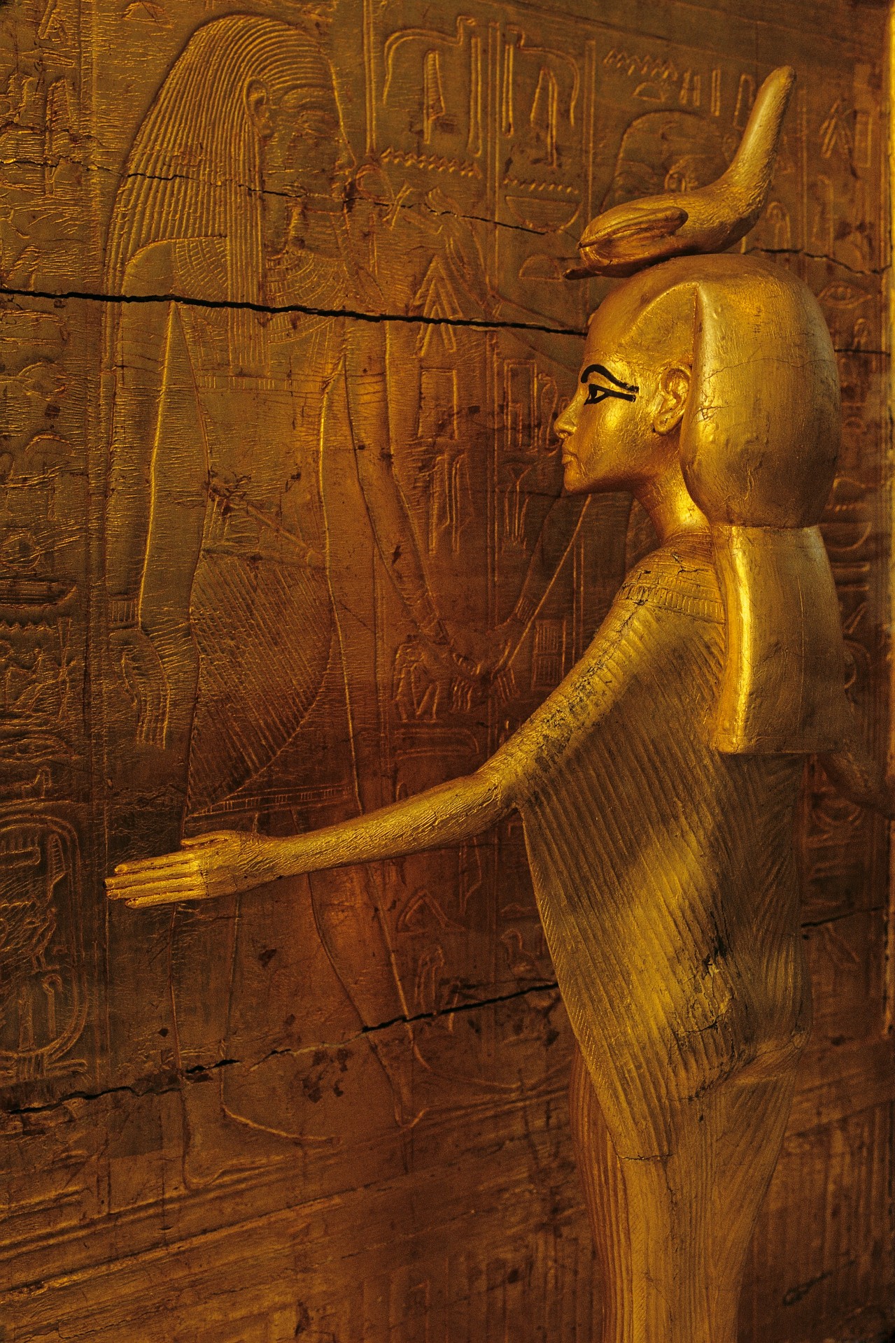 Spreading her arms in protection, a gilded wooden statue of the goddess Selket guards a shrine from King Tutankhamun’s tomb. On her head is a scorpion, her identifying feature. Inside the shrine stood a calcite chest containing the jars that held the king’s viscera.