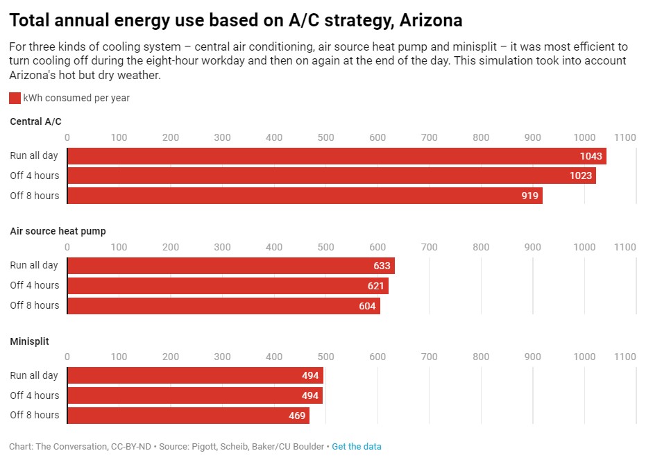 We are a team of architectural and building systems engineers who used energy models that simulate heat transfer and A/C system performance to tackle this perennial question: Will you need to remove more heat from your home by continuously removing heat throughout the day or removing excess heat only at the end of the day?