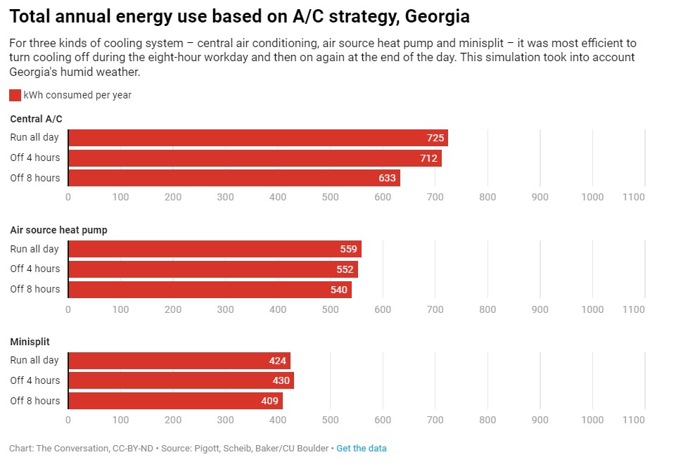 According to our unpublished calculations, letting your home heat up while you’re out at work and cooling it when you get home can use less energy than keeping it consistently cool – but it depends.