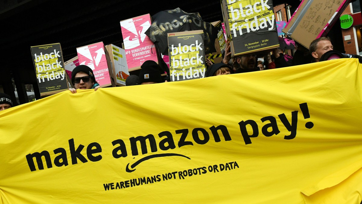 Amazon warehouse workers protest outside the Axel Springer building on April 24, 2018 in Berlin, Germany. Several hundred Amazon warehouse workers from Germany, Poland and Italy protested outside the Axel Springer building, where inside Amazon CEO Jeff Bezos was scheduled to receive an award for innovation. The workers claim Amazon pays too little and offers too few benefits.