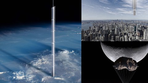 The innovative idea that the design firm Clouds Architecture Office calls the “Universal Orbital Support System,” is to place a large asteroid into orbit right above earth, at the height of about 50,000 km (31,068 miles). That would be way higher than the International Space Station which is at only 249 miles above. A strong cable would be lowered from the asteroid. And from that cable a very tall tower tower would be suspended.