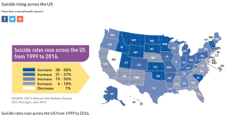 The Center for Disease Control has published research that shows a dramatic 25% increase in suicide rates since 1999. Half of all U.S. states experienced an increase of more than 30%.