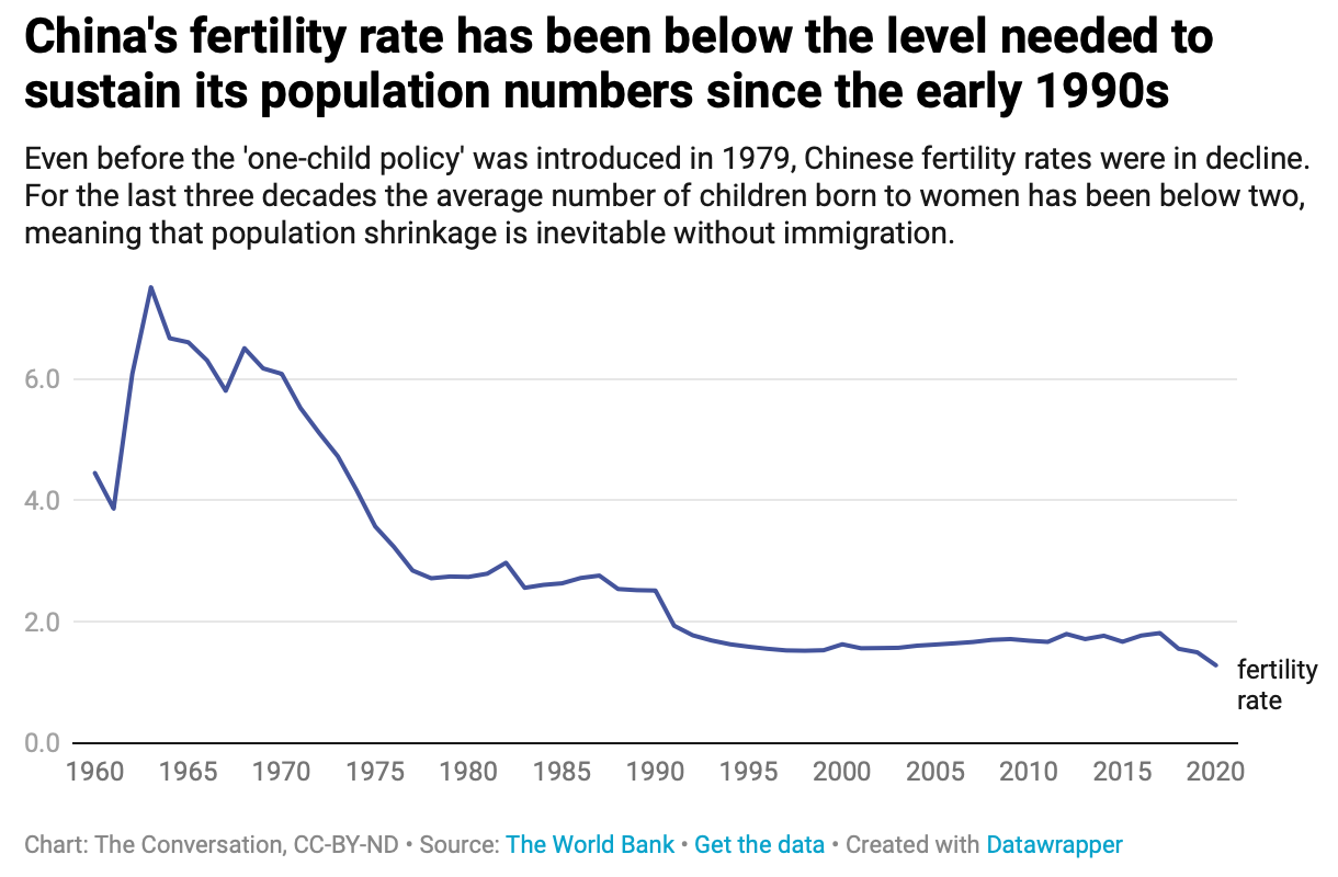 Indeed, there is already a strong case to be made that the Chinese government has moved too slowly. The one-child policy that played a significant role in the slowing growth, and now decline, in population was a government policy for more than three decades. It has been known since the 1990s that the Chinese fertility rate was too low to sustain current population numbers. Yet, it was only in 2016 that Beijing acted and relaxed the policy to allow more couples to have a second, and then in 2021 a third, child.
