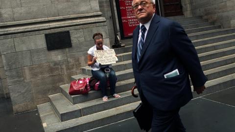 A businessman walks by a woman asking for money in New York City.