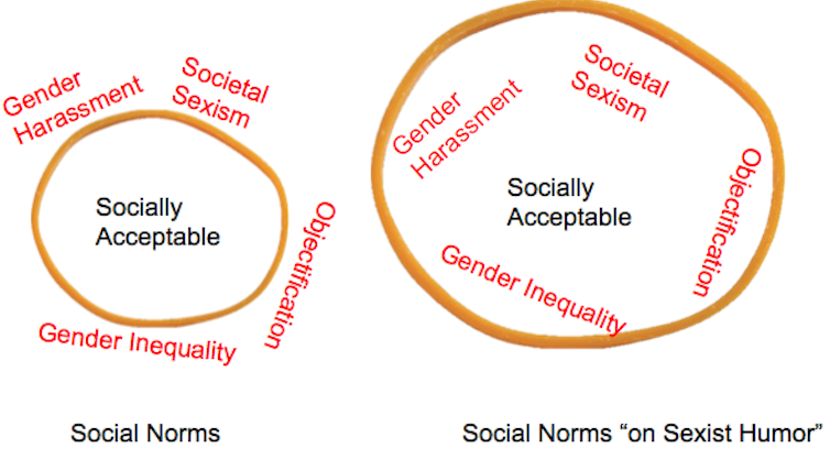 Sexist humor essentially stretched the rubber band; it expanded the bounds of acceptable behavior to include responses that would otherwise be considered wrong or inappropriate. So, in this context of expanded acceptability, sexist men felt free to express their antagonism without the risk of violating social norms and facing disapproval from others. Sexist humor signaled that it’s safe to express sexist attitudes.