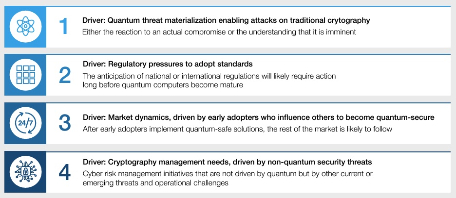 The rise of quantum computing has increased the need to develop and implement post-quantum cybersecurity mechanisms. In a 2022 white paper, Transitioning to a Quantum-Secure Economy, the World Economic Forum detailed various drivers that can accelerate the transition. This includes quantum-powered cyber threats, regulatory pressures and market dynamics, among others.