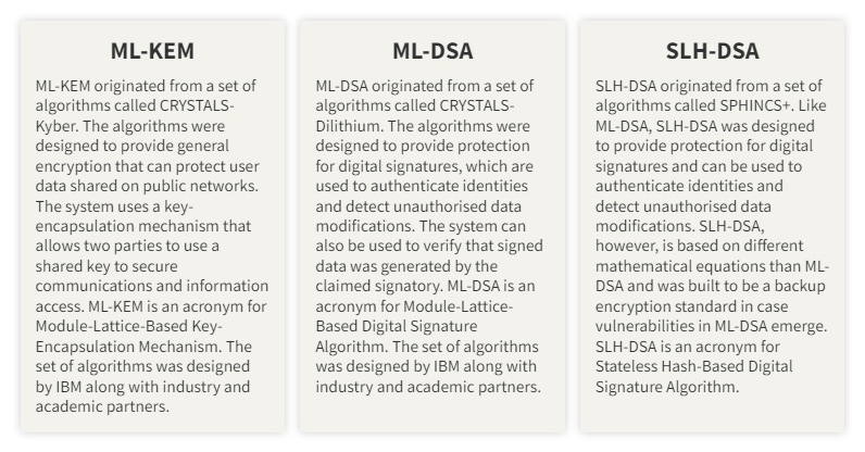 Out of dozens of submissions, four were chosen to be standardised, three of which were released this month: ML-KEM, ML-DSA and SLH-DSA. All three post-quantum cryptographic algorithms are based on highly complex math equations that experts maintain can withstand the heightened computing power of quantum computers, keeping websites and internet traffic secure from third-party intrusions.