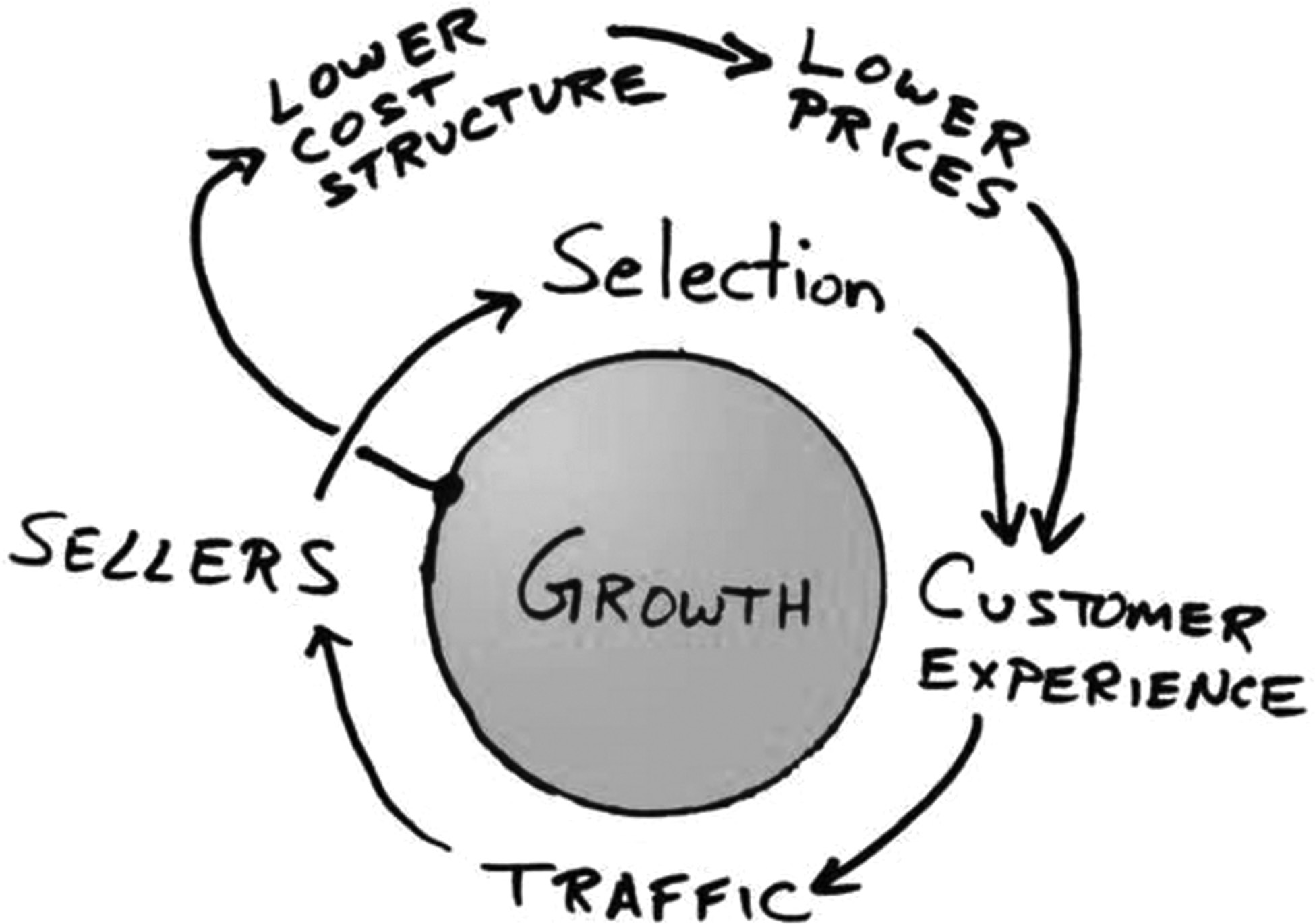 But Bezos was focused on the long term. He’d invited Collins to talk to the board and senior managers about sustainable growth, so Collins drew for us an Amazon-specific flywheel. It showed a virtuous cycle, where low prices brought in customers, and more customers allowed Amazon to add more products for sale, the volume reducing prices further and attracting still more customers in a gradually accelerating flywheel. Bezos liked this concept, and the flywheel — with a few Bezos modifications — became a key part of his guiding philosophy at Amazon. He often uses it in employee meetings and public presentations.