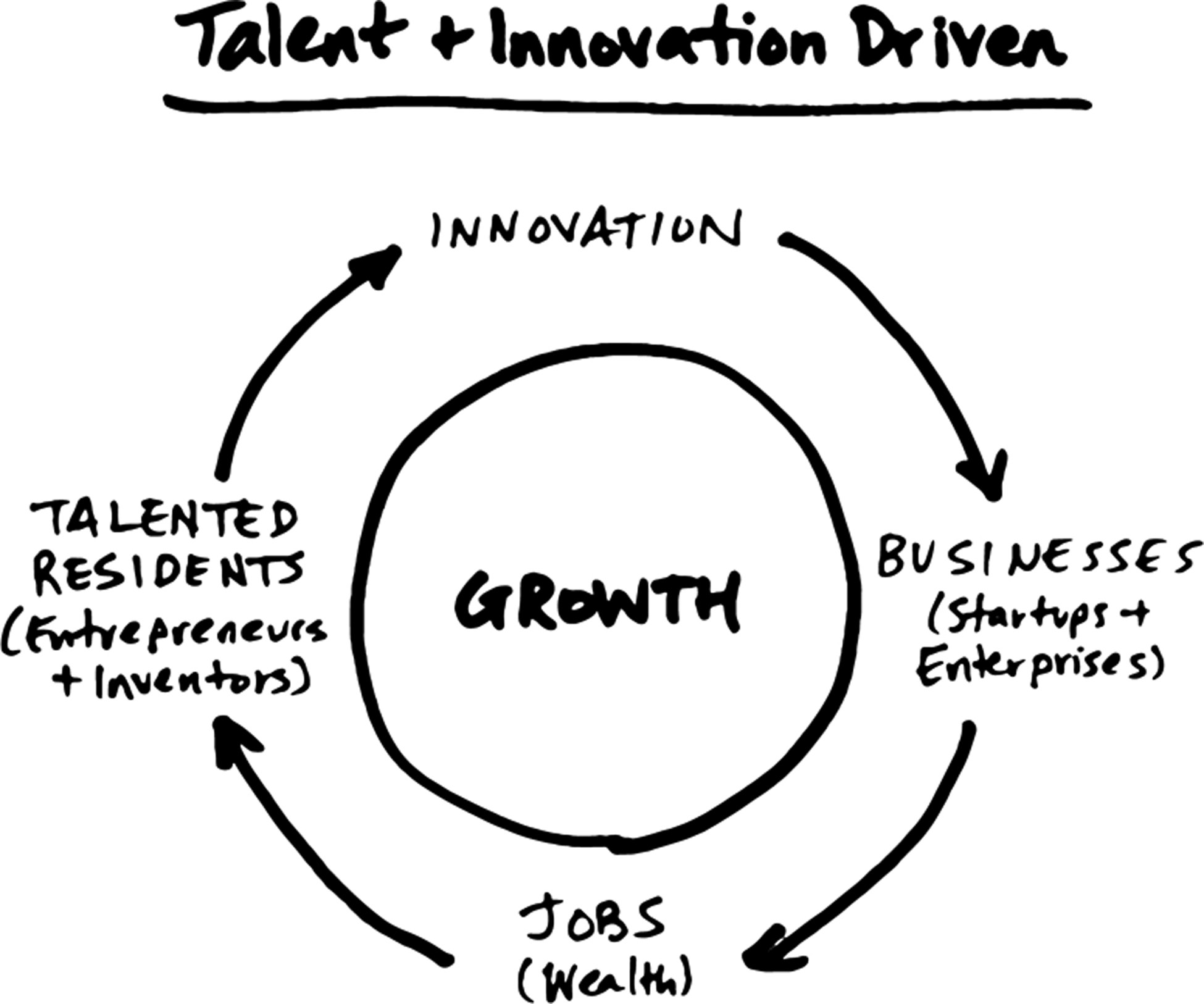 In Seattle’s version, it begins with talented people — entrepreneurs, inventors, and leaders — who create innovations which begets startups. Startups spawn successful companies that then attract talented people who create innovations. Successful companies also generate wealth and jobs, which provides the energy to support the new startups that those creative people inevitably launch. And so the cycle continues. As more talented people move to Seattle, more innovations give rise to new companies, which attract more creative people, and the flywheel accelerates.