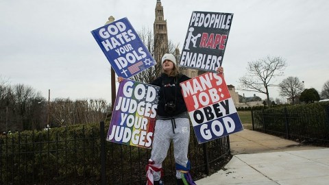 A member of the Westboro Baptist Church demonstrates outside the Basilica of the National Shrine of the Immaculate Conception. (Photo: NICHOLAS KAMM/AFP/Getty Images)