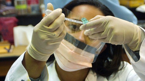 Forensic scientist Jasmine Thomas prepares blood samples for DNA extraction for evidence in a sexual assault case in the Forensic Evidence section of the Louisiana State Crime Lab June 4, 2003 in Baton Rouge, Louisiana. (Photo by Mario Villafuerte/Getty Images)