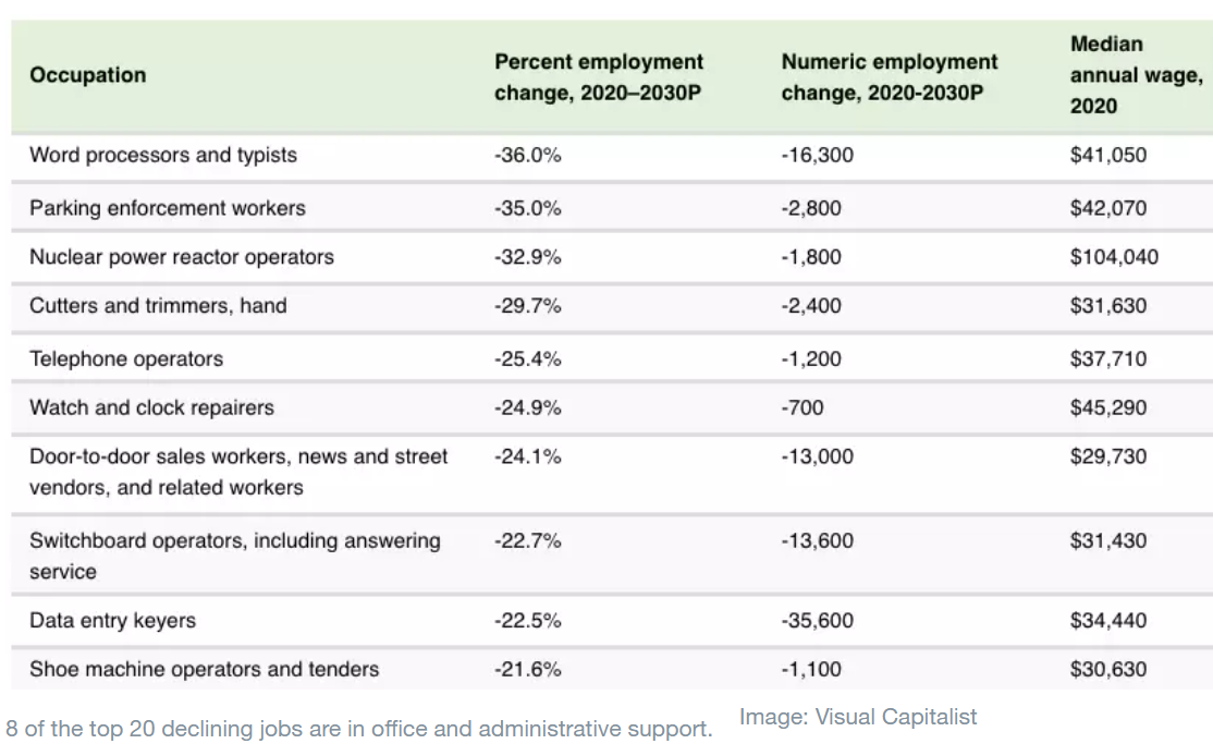 Structural changes in the economy will cause some jobs to decline quite quickly. Here are the top 20 jobs where employment is expected to decline the fastest over the next decade.