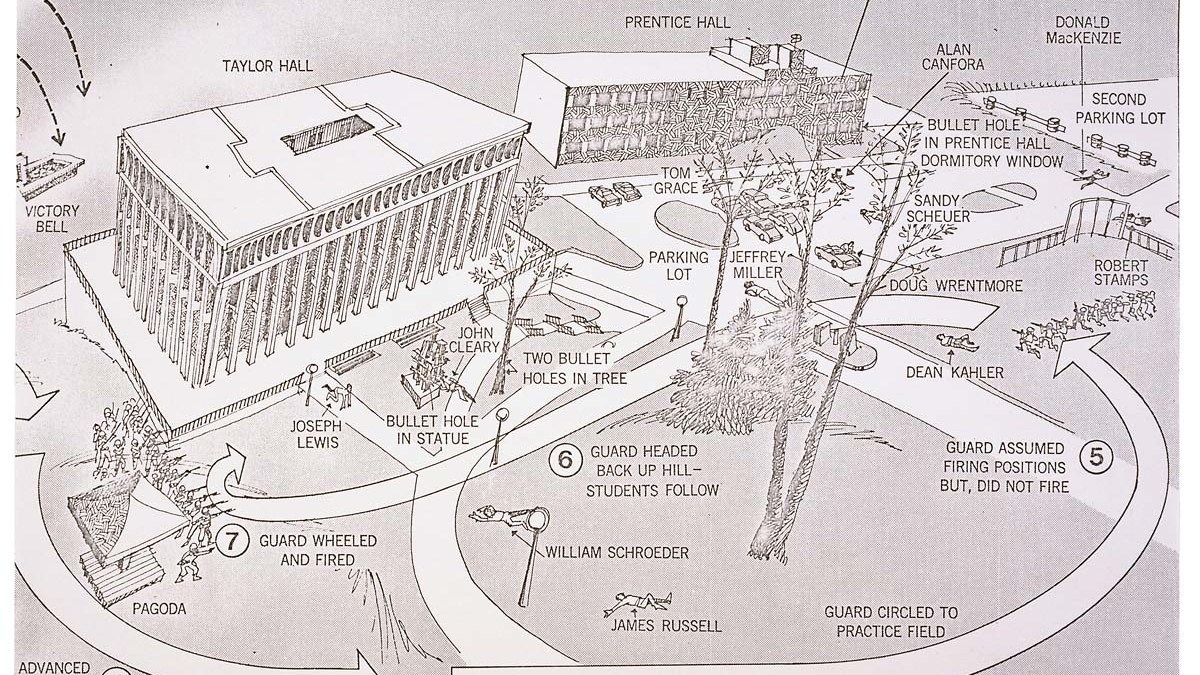 “Shortly before noon, General Canterbury made the decision to order the demonstrators to disperse. A Kent State police officer standing by the Guard made an announcement using a bullhorn. When this had no effect, the officer was placed in a jeep along with several Guardsmen and driven across the Commons to tell the protestors that the rally was banned and that they must disperse. This was met with angry shouting and rocks, and the jeep retreated. Canterbury then ordered his men to load and lock their weapons, tear gas canisters were fired into the crowd around the Victory Bell, and the Guard began to march across the Commons to disperse the rally. The protestors moved up a steep hill, known as Blanket Hill, and then down the other side of the hill onto the Prentice Hall parking lot as well as an adjoining practice football field. Most of the Guardsmen followed the students directly and soon found themselves somewhat trapped on the practice football field because it was surrounded by a fence. Yelling and rock throwing reached a peak as the Guard remained on the field for about 10 minutes. Several Guardsmen could be seen huddling together, and some Guardsmen knelt and pointed their guns, but no weapons were shot at this time. The Guard then began retracing their steps from the practice football field back up Blanket Hill. As they arrived at the top of the hill, 28 of the more than 70 Guardsmen turned suddenly and fired their rifles and pistols. Many guardsmen fired into the air or the ground. However, a small portion fired directly into the crowd. Altogether between 61 and 67 shots were fired in a 13-second period.”