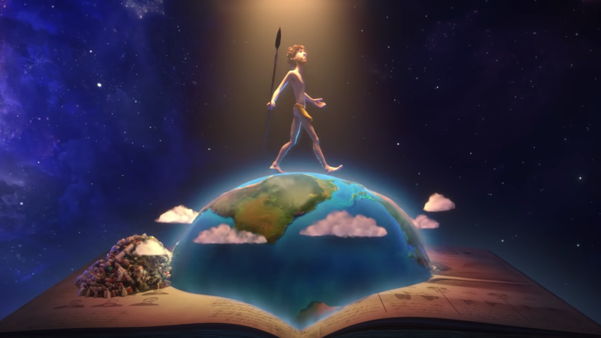 The video then takes a somewhat unexpected turn, as caveman-Dicky starts touring the modern world’s countries and continents, injecting some sociopolitical commentary on top of the Earth Day stuff:
