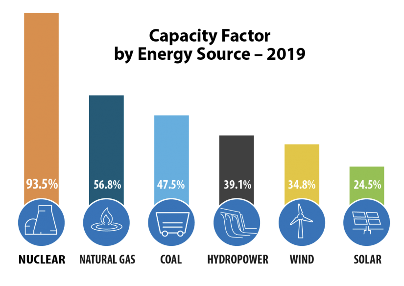 Nuclear power plants produce energy through nuclear fission — a process that does not pollute the environment with carbon dioxide or other greenhouse gases. Compared to all other energy sources, nuclear power plants have, by far, the highest capacity factor, which is a measure of how often a power plant is producing energy at full capacity in a given period of time. Renewables sometimes lack in this department: the wind doesn’t always blow, and the sun doesn’t always shine.