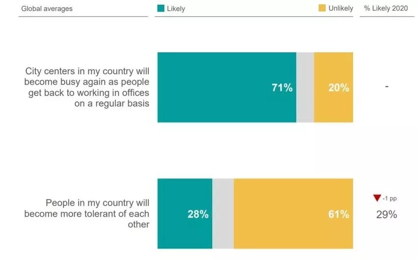More than seven in 10 (71%) think city centres will become more vibrant as people return to working in offices in 2022. Nine out of 10 (87%) people in China say this is likely to happen as do four in five (78%) in Argentina, Brazil and Colombia.