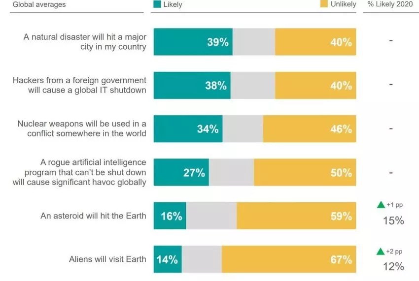 Of course, there’s still plenty to worry about in 2022. But according to the survey, alien invasion is not top of most people’s lists – only 14% thought it was likely although almost a third of people in India are expecting to greet visitors from another planet.