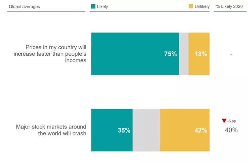 Although three quarters of people around the world expect prices in their countries to rise faster than incomes, over two fifths (42%) think a stock market crash is unlikely.