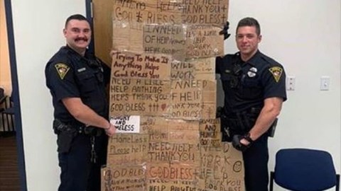 The officers smiling in the photo, Preston McGraw and Alexandre Olivier, are recent graduates of the Mobile Police Academy, according to Al.com.Two other people are mentioned in the Facebook post, but it’s not clear who they are, or whether they work for the Mobile Police Department. In the Facebook photo, McGraw and Olivier hold signs that display pleas like, “Trying to make it, anything helps, god bless you.” The photo caption reads: