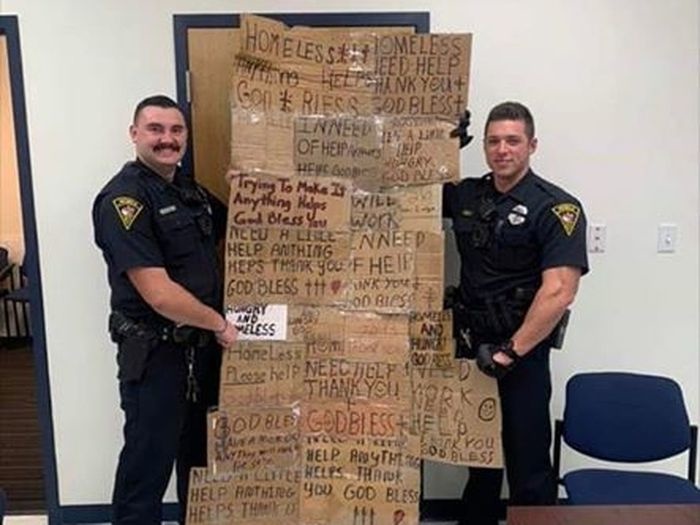 The officers smiling in the photo, Preston McGraw and Alexandre Olivier, are recent graduates of the Mobile Police Academy, according to Al.com.Two other people are mentioned in the Facebook post, but it’s not clear who they are, or whether they work for the Mobile Police Department. In the Facebook photo, McGraw and Olivier hold signs that display pleas like, “Trying to make it, anything helps, god bless you.” The photo caption reads: