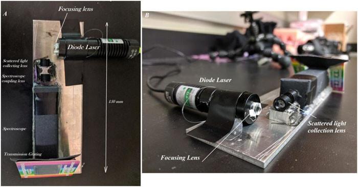 To build the spectrometer, the researchers connected a smartphone to a laser and a series of plastic lenses. The smartphone camera was placed facing a transmission diffraction grating, which splits incoming light into its constituent wavelengths and colors. After a laser is fired into a sample, the scattered light is diffracted through this grating, and the smartphone camera analyzes the light on the other side.