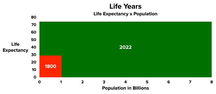 In 1800, there were only one billion people on the planet, and the average life expectancy was 28.5 years. The current average life expectancy in the world hovers around 73 years, with men at 71 years, and women at 75 years. In contrast to our ancestors, we are getting 45 more years to live. That’s a lot of additional life-years, as the chart below shows.