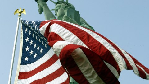 Yue Fen Li holds her flag as her mother Grace Li from China is sworn in as a new U.S. citizens with 3,000 others at the Miami Beach Convention Center in Miami Beach, Florida. (Photo by Joe Raedle/Getty Images)