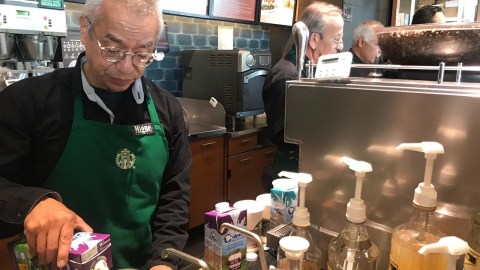 Miguel Angel Martinez Sarmiento works as a barista in a branch of the US coffee house 'Starbucks' and pours milk into a can. All the employees at the coffee shop, which opened in Del Valle Sur at the beginning of September, are over 60 years old. (Photo by Antonia Märzhäuser/picture alliance via Getty Images)