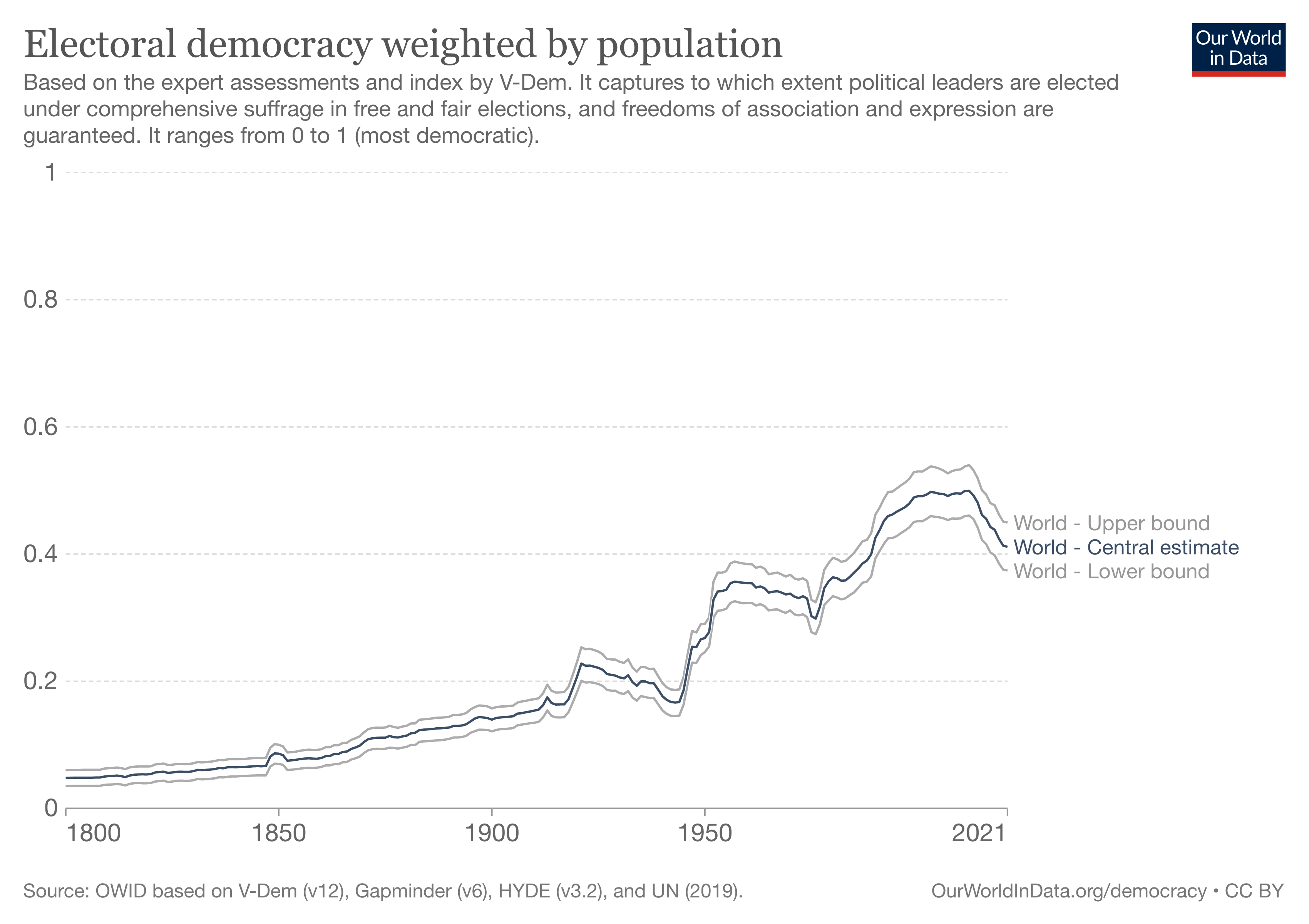 The second chart instead tells us about how many democratic rights people have by weighing a country’s democracy score by its population.9 Calculated this way, peoples’ democratic rights have decreased as well: countries received a population-weighted average score of 0.41 for electoral democracy in 2021. This is down from an all-time high of 0.5 in 2012.