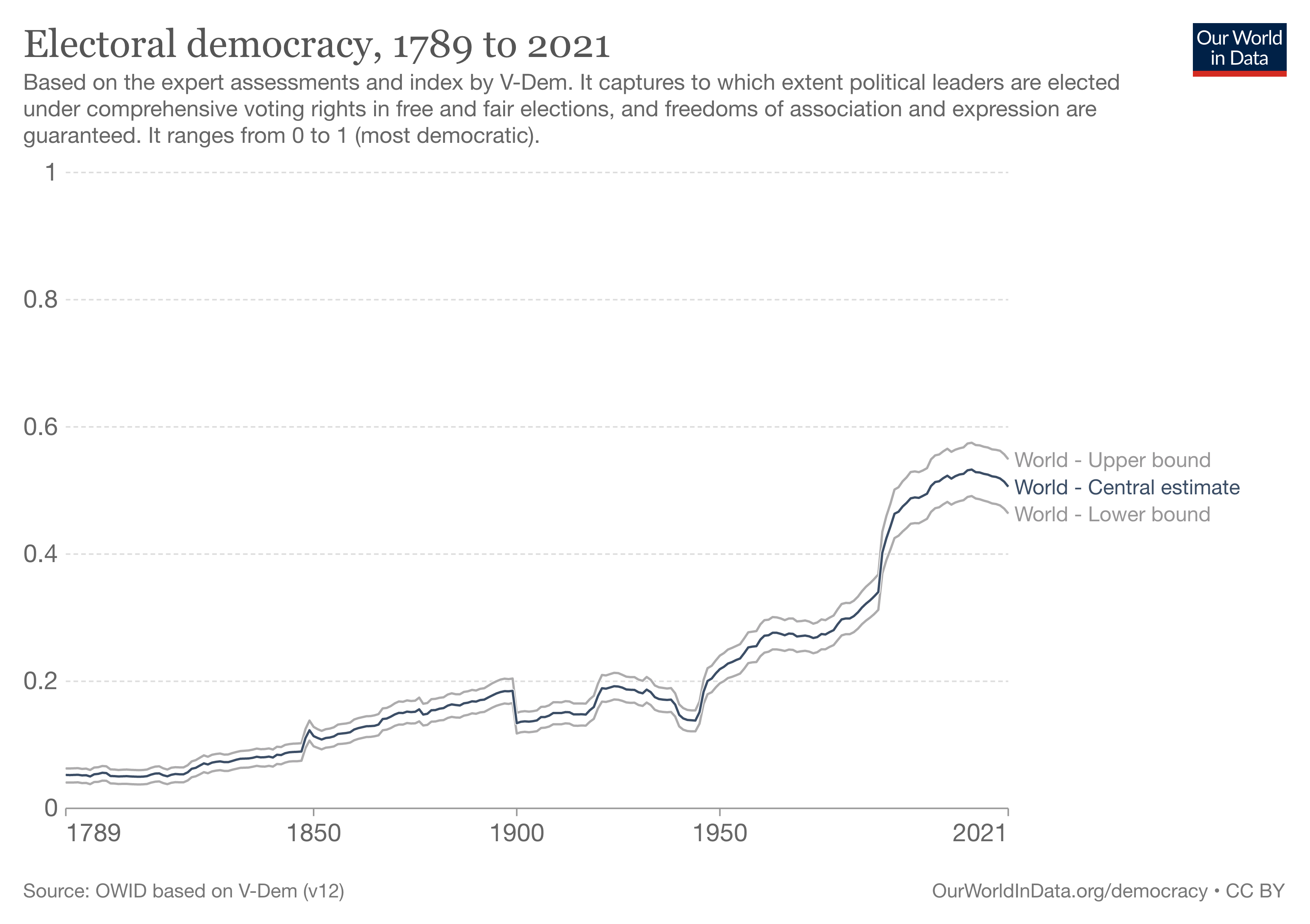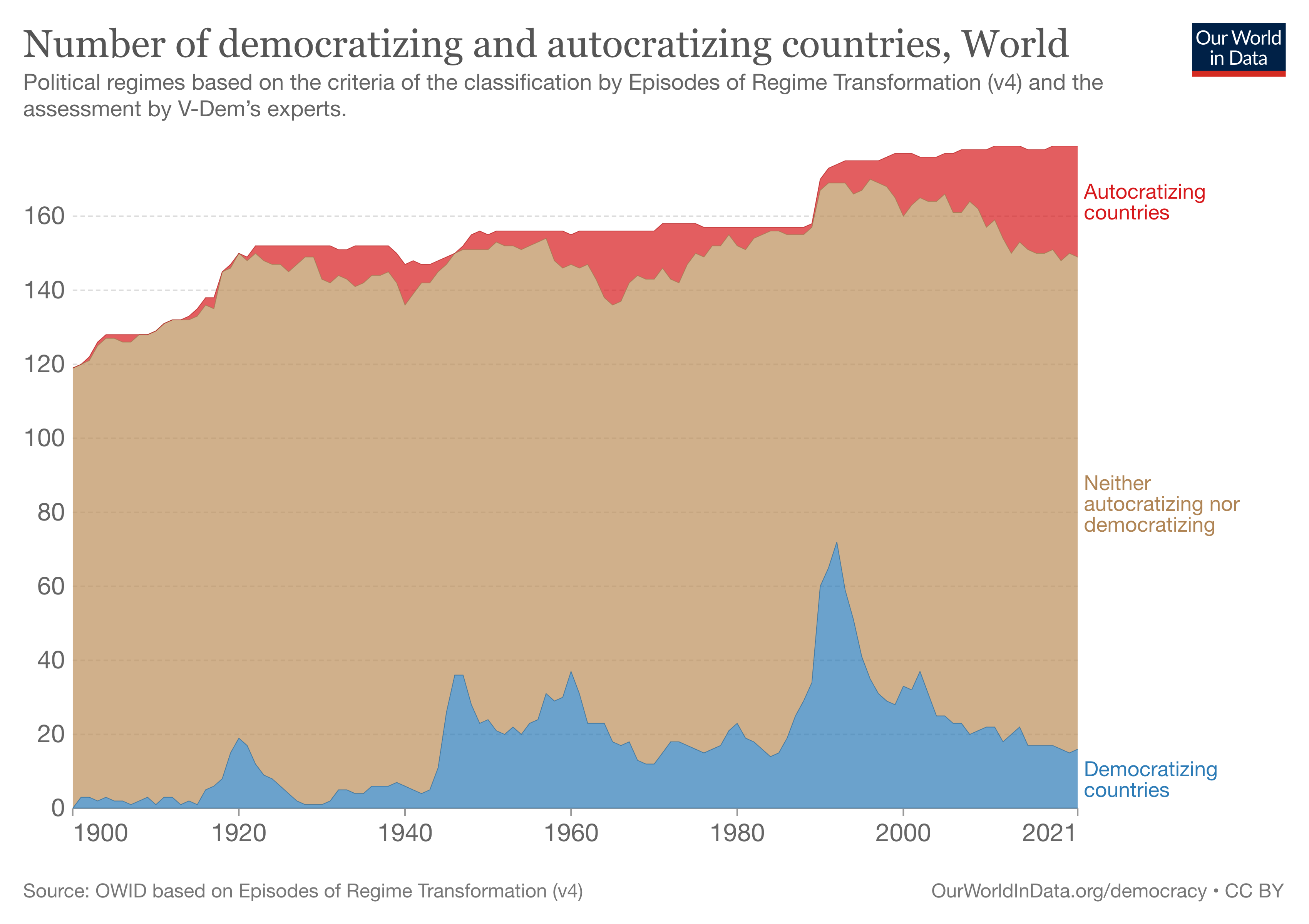 Based on the data here, the democratic decline has been substantial. We can readily identify it in the different charts above. We can do so even though the charts put the recent trends into the historical context of the last two centuries. The world has fallen from all-time democratic highs to now — depending on the specific metrics — look more like the 2000s, the 1990s, or even the late 1980s.