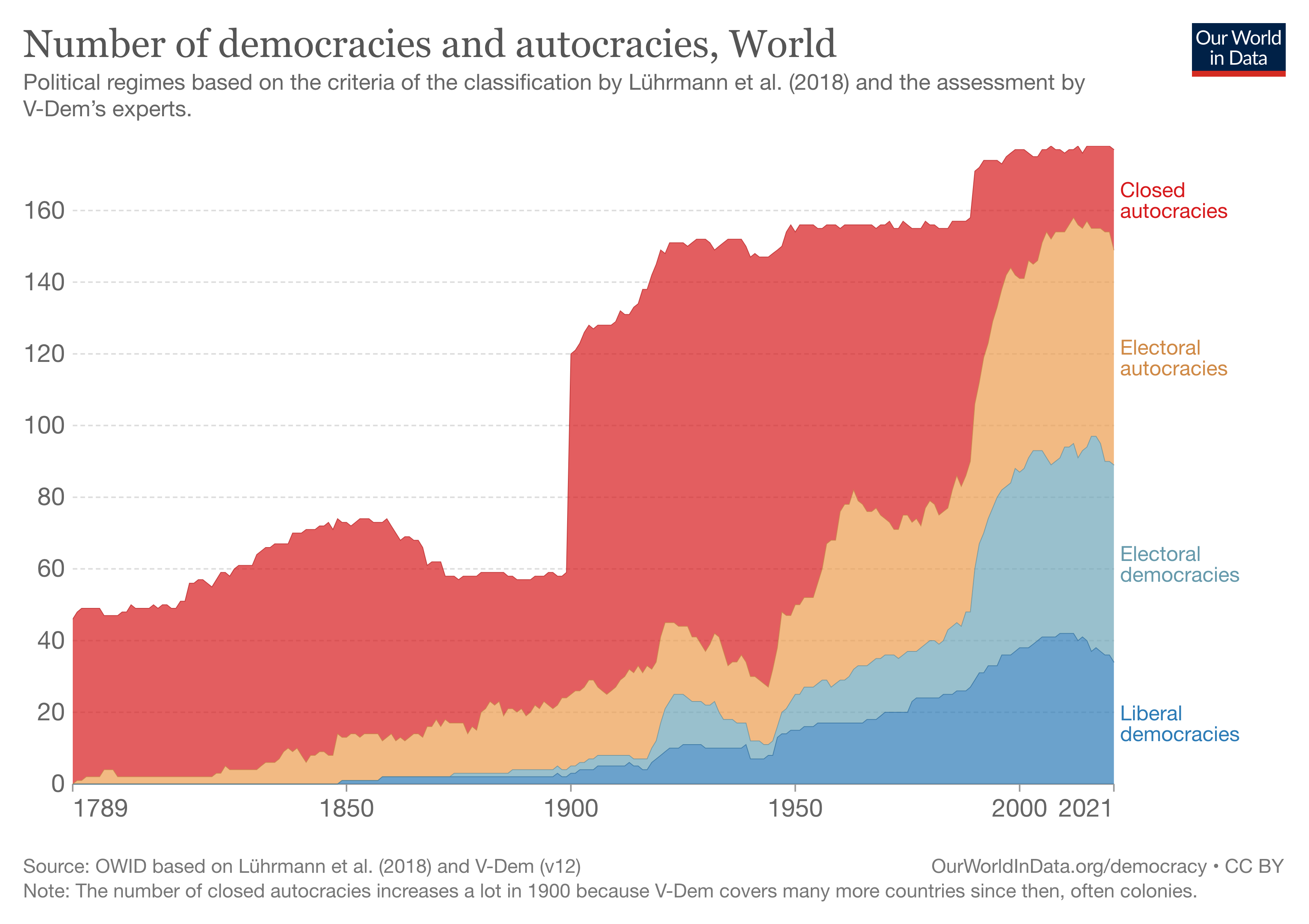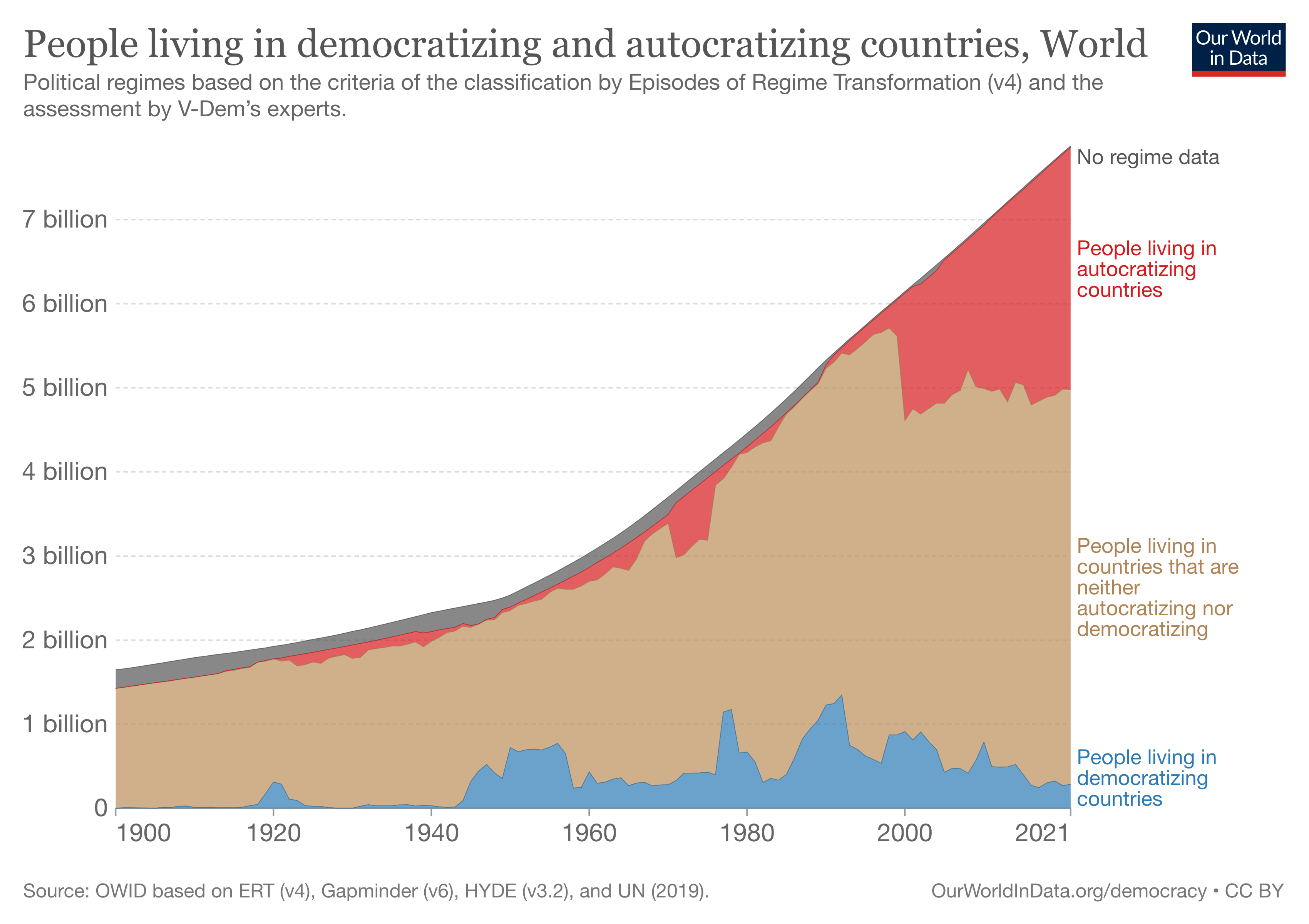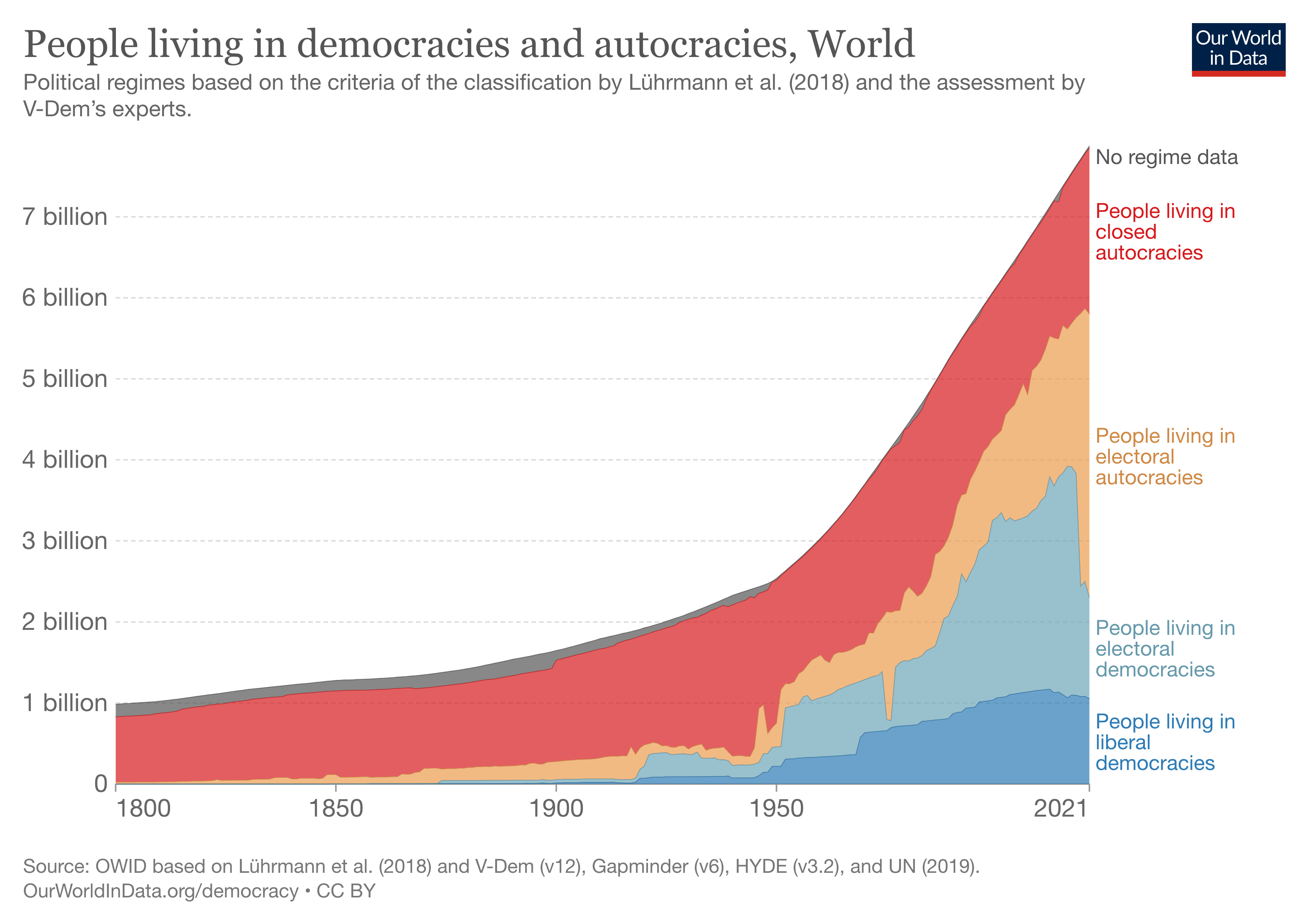 Looking at the number of democracies and the people living in them tells us about big changes worldwide: when countries become democracies, or stop being liberal or electoral democracies altogether.