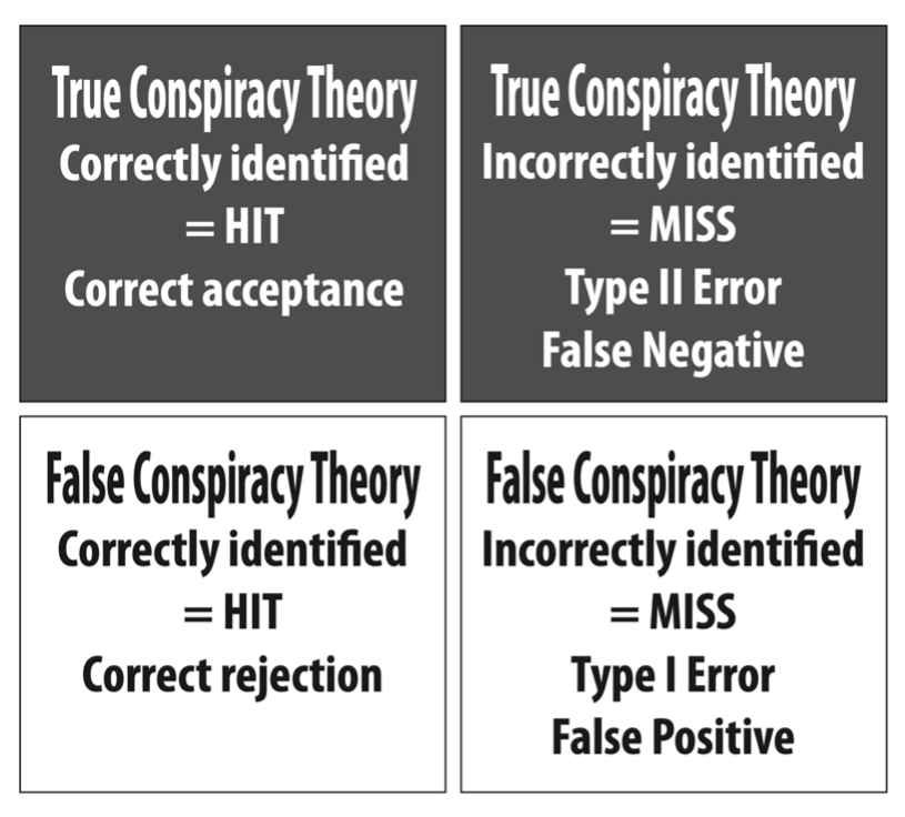 Signal Detection Theory aims to assess if a signal, or information, represents a true or false signal, and our decision as to whether or not the signal is true or false affords us to diagram a 2×2 choice matrix. The upper-left cell represents conspiracy theories that are true and that you correctly identify as such. That’s called a hit. The upper-right cell represents conspiracy theories that are true but that you incorrectly identify as false. That’s called a miss, or a False Negative, or a Type II Error. The lower-left cell represents conspiracy theories that are false and you correctly identify them as such, and that is called a correct rejection, another type of hit. The lower-right cell represents conspiracy theories that are false but that you incorrectly identify as true; that is, you think the theory represents a true conspiracy but it doesn’t. That’s called a False Positive, or a Type I Error.