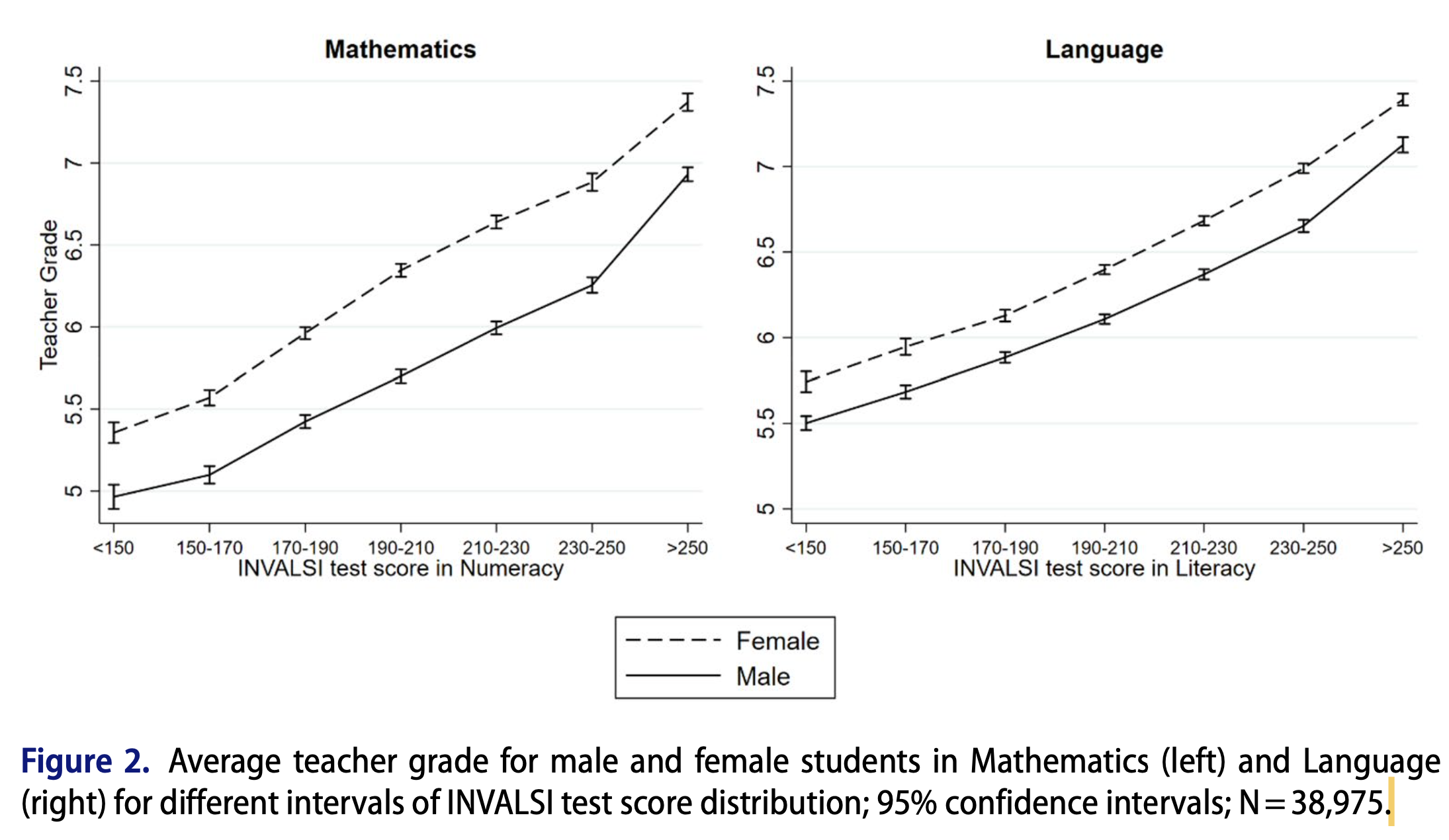 - A recently published study of 39,000 Italian tenth graders found that for male and female students who have identical subject-specific competence, teachers give higher grades to girls.
