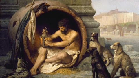 Cynicism is most associated with a man called Diogenes of Sinope (but this comes only second-hand from Plato and Aristotle, because Diogenes’ own work largely has been lost). Cynics argued that the artificial trappings of civilization repressed, enslaved, and debased the human spirit. They despised all the abstracted philosophizing of the likes of Plato and his school, The Academy, thinking they were both pretentious and pointless. Instead, we should return to nature as much as possible, fulfilling only our basic needs. In fact, Diogenes was nicknamed “the dog” for his vagrant, sparse, and basic living conditions.