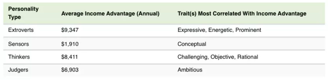 For instance, extroverts are much more likely to have higher incomes if they are quick to share thoughts, have high energy, and like being in the public eye. Thinkers also score high on income potential, especially if they enjoy debates, make rational decisions, and moderate their emotions.