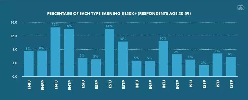 The one exception is INTJs, with 10% earning an annual salary of $150K or more in their peak earning years.