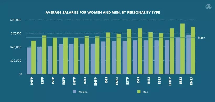 When the average salaries were separated for men and women, the results were clear: men of almost all personality types earn more than the average income for the sample overall, while all but two personality types of women earned less than the average.