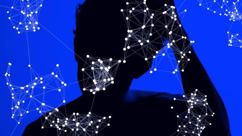 Silhouette of a person against a blue background, overlaid with white node and line networks.