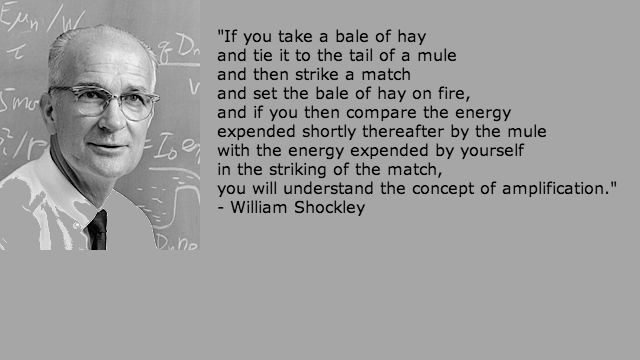 “If you take a bale of hay and tie it to the tail of a mule and then strike a match and set the bale of hay on fire, and if you then compare the energy expended shortly thereafter by the mule with the energy expended by yourself in the striking of the match, you will understand the concept of amplification.” – William Shockley (born on this date in 1910)
