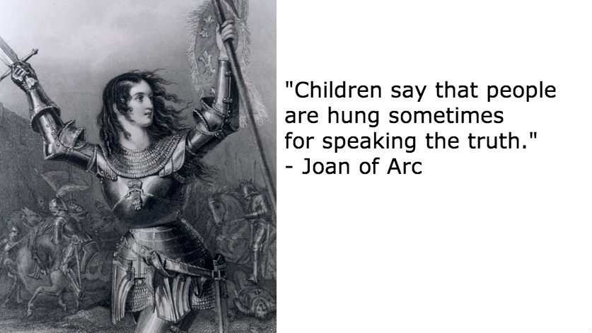 “Children say that people are hung sometimes for speaking the truth.” – Joan of Arc (born on this date in 1412)