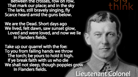 Canadian physician Lt. Col. John McCrae (1872-1918) composed this iconic poem after presiding over the funeral of a friend killed at the 2nd Battle of Ypres in 1915. He died of pneumonia at the age of 45 while commanding a war hospital in Boulogne, France. The image of the red poppy is ubiquitous in the international observance of November 11 as Veteran’s Day, Remembrance Day, and Armistice Day.